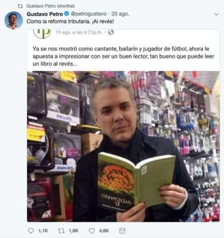 En efecto en la fotografía que es fake, aparece el presidente Duque leyendo un libro al revés, lo curioso es que la imagen que circula en redes sociales hace ya varios días también había sido etiquetada con el rótulo «fake», de ahí la molestia de muchos que creen en la «inocencia» del exaspirante presidencial y senador Gustavo Petro, y en contraste a brindarle su apoyo, literalmente se lo están acabando en las redes sociales. Entre los tantos duros comentarios lo señalan de promover las noticias falsas, otros por su parte le piden que rectifique o se retracte de su comentario.
