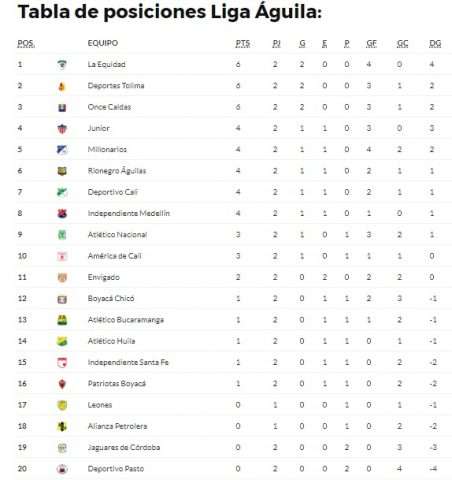 Tras haberse jugado todos los juegos correspondientes de la jornada que inició el pasado viernes 27 de julio en el estadio Metropolitano de Techo, de Bogotá, con el encuentro en el que La Equidad derrotó 2-0 a Jaguares y culminó ayer en el estadio Metropolitano de Itagüí donde Alianza se impuso por la mínima diferencia ante el local, Leones F.C.