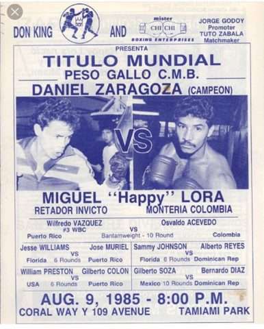 Un 9 de agosto pero de 1985, es decir hace 33 años, el pugilista cordobés Miguel ‘Happy’ Lora se consagró Campeón Mundial Gallo del CMB luego de derrotar a su similar mexicano Daniel Zaragoza, en Miami, Estados Unidos.
