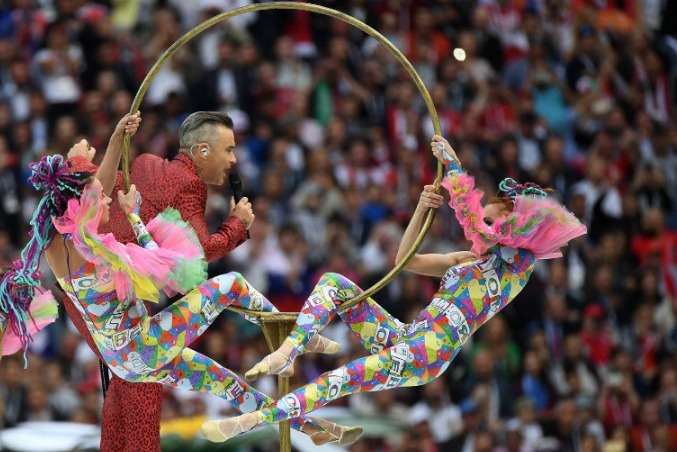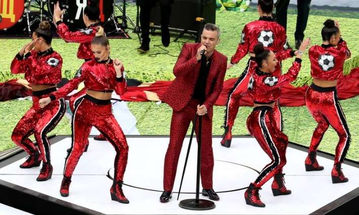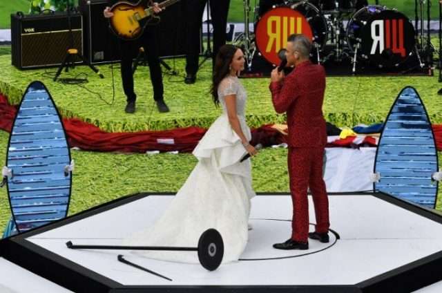Williams realizó el show central de apertura en el Estadio Luzhnikí de Moscú, junto a la Solista de la Opra Statal, Aida Garifullina, quien llegó vestida con un majestuoso vestido largo.