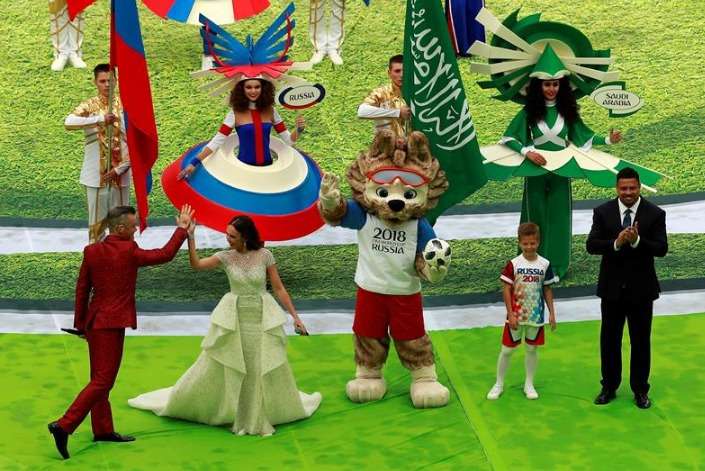 Williams realizó el show central de apertura en el Estadio Luzhnikí de Moscú, junto a la Solista de la Opra Statal, Aida Garifullina, quien llegó vestida con un majestuoso vestido largo.