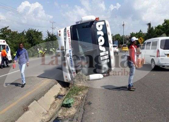 Asustados quedaron los pasajeros de un bus de la empresa Brasilia que cubría la ruta Montería – Barranquilla, luego de que este se volcara en la vía y sus ocupantes cayeran unos sobre otros.