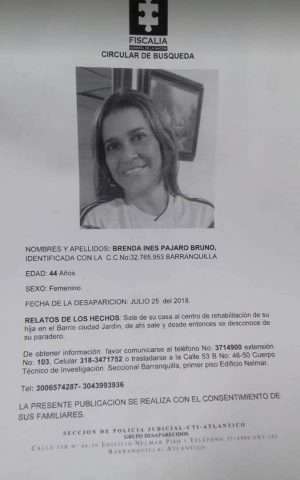 Preocupados se encuentran los familiares de Brenda Pájaro Bruno, de 44 años de edad, quien desapareció en horas de la tarde del pasado miércoles 25 de julio tras llevar a su hija a una cita médica en el barrio Ciudad Jardín, ubicado en el norte de Barranquilla.