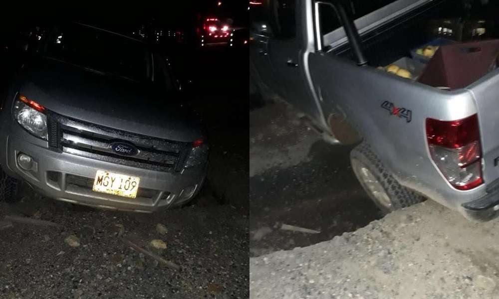 La camioneta de color gris marca Ford 4×4, con placa MGY-109 cayó en los huecos dejados por la concesión de Ruta al mar, donde pretenden rehubicar el peaje El Purgatorio.