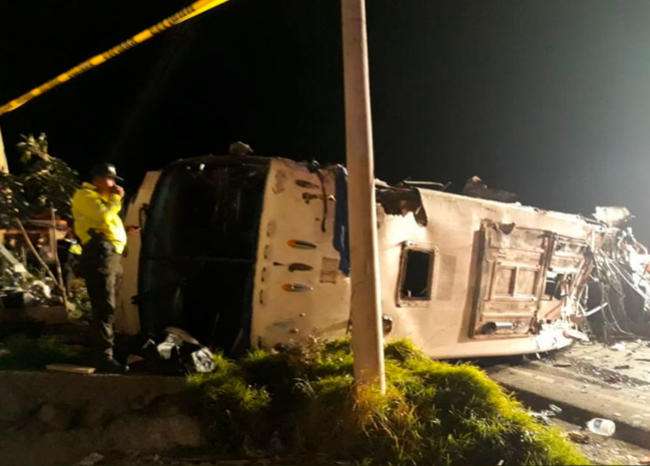 Según el reporte de las autoridades, un bus que cubría el trayecto entre Bogotá y Quito volcó tras chocar con un coche a 80 kilómetros de Quito en la que se le denomina “la curva de la muerte”.
