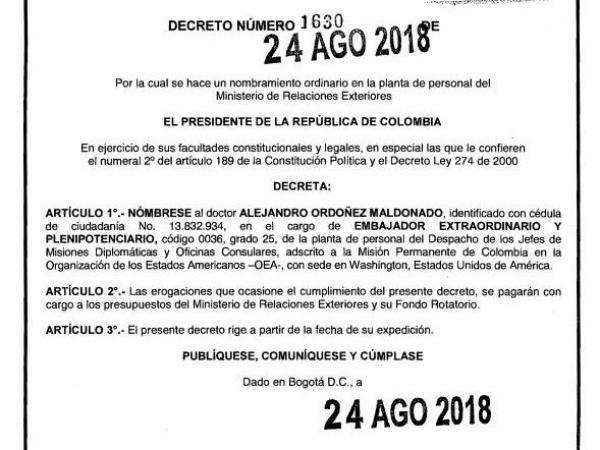 El ministro de Relaciones Exteriores, Carlos Holmes Trujillo, firmó este viernes el decreto 1630 del 24 de agosto del 2018, que dejó en firme el nombramiento de Alejandro Ordóñez como nuevo embajador de Colombia ante la Organización de Estados Americanos (OEA).