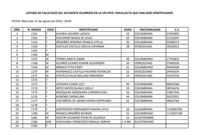 Luego de la labor realizada por Medicina Legal y la Interpol, hasta el momento, se ha podido identificar 14 de los 19 colombianos que murieron en el accidente de un bus en Papallacta, en Ecuador que se registró el pasado martes 14 de agosto.