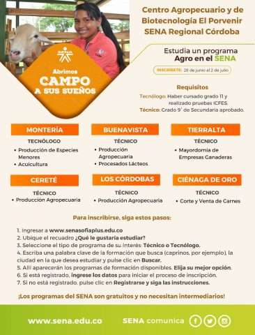 Para el caso del departamento de Córdoba, en el Centro Agropecuario y de Biotecnología El Porvenir, se están ofertando en Montería los tecnólogos en Producción de Especies Menores y Acuicultura; en Cereté y Los Córdobas el técnico en Producción Agropecuaria; en Buenavista los técnicos en Producción Agropecuaria y Procesados Lácteos; en Ciénaga de Oro el técnico en Corte y Venta de Carnes y en Tierralta el técnico en Mayordomía de Empresas Ganaderas.