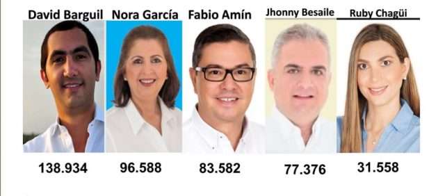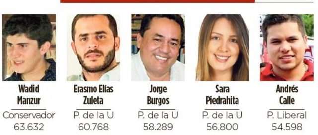 Ellos son Wadirh Manzur del partido Conservador, quien obtuvo la mayor votación en Córdoba con 63 mil 214 votos. La segunda votación fue la de Wadirh Manzur con 60 mil 467 votos, y la tercera fue la de Jorge Burgos, con 57 mil 785, les siguen Sara Piedrahita con 56 mil 263 y Andrés Calle, quien logró 54 mil 229 votos.
