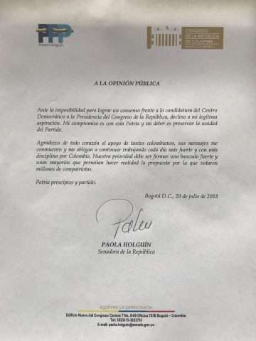 Antes de la ceremonia de instalación del nuevo Congreso de la República, la senadora del Centro Democrático Paola Holguín emitió un comunicado donde renunciaba a su aspiración a la presidencia de la corporación.