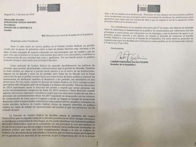 El senador Carlos Fernando Galán, del partido Cambio Radical anunció su renuncia tanto a su partido como a su curul en el Senado luego de que su partido tomara la decisión de “apoyar” al candidato presidencial por el Centro Democrático, Iván Duque a la presidencia de la República.