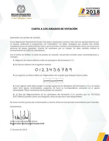 De acuerdo con el Registrador Nacional, Juan Carlos Galindo, si usted va a ser jurado de votación de las elecciones presidenciales en segunda vuelta que se celebrarán este domingo 17 de junio debe tener en cuenta unos lineamientos e instrucciones establecidas por la Registraduría.