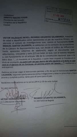 La solicitud hecha por los juristas Víctor Velásquez Reyes y Ricardo Cifuentes gira entorno a que el presidente Juan Manuel Santos, quien está próximo a dejar el cargo como mandatario de Colombia, no se vaya del país una vez termine su periodo de gobierno.