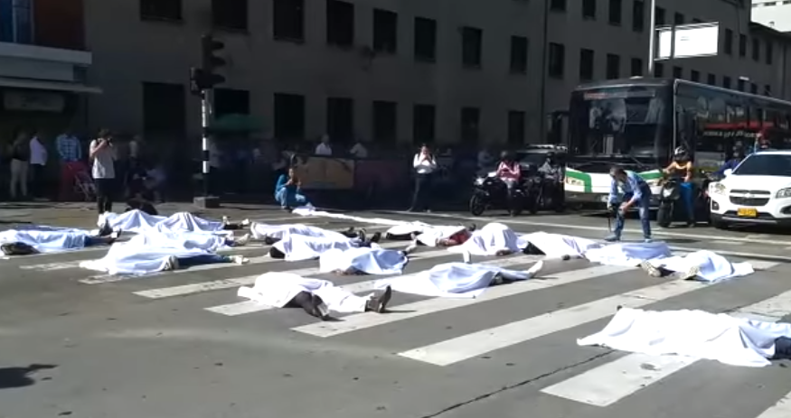 Tendidos sobre la carretera y con una sábana blanca sobre su cuerpo llamaron la atención de los transeúntes y los conductores de los vehículos que diariamente circulan por la avenida Oriental del sector Ayacucho.