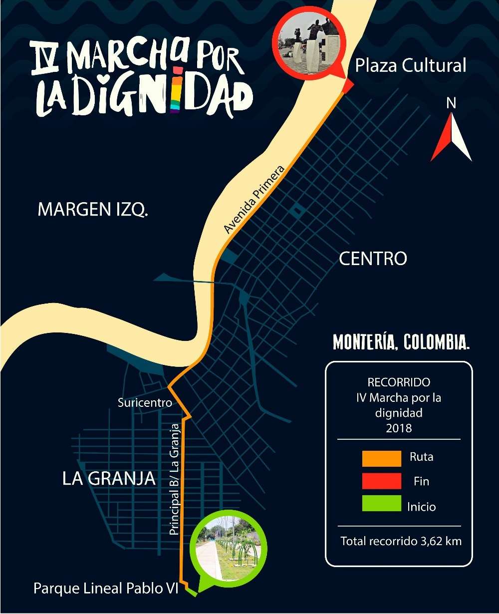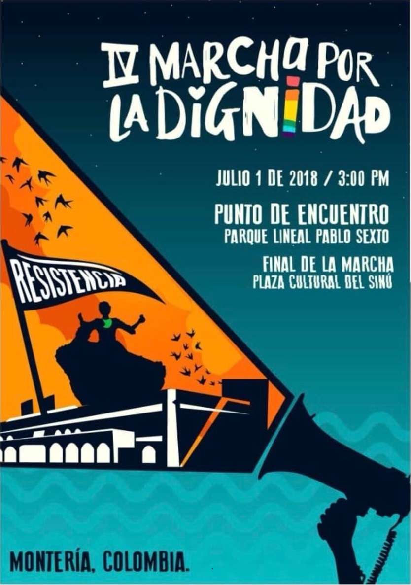 Las organizaciones juveniles de la comunidad LGBTI de Montería convocan a la realización de la lV Marcha por la Dignidad de las Diversidades Sexuales y de Género para conmemorar la celebración del Orgullo LGBTI 2018 este domingo 1 de julio. La manifestación iniciará a partir de las 3:00 de la tarde y tiene como punto de encuentro el recién inaugurado Parque Lineal de Pablo Sexto.