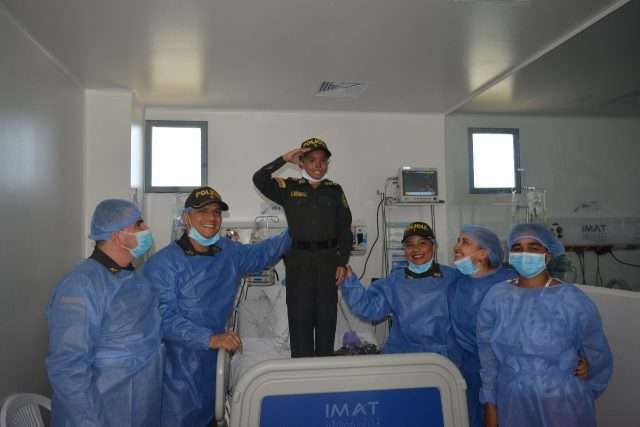 La inolvidable tarde para Kevin Andrés, comenzó cuando el señor Coronel Fredy Orlando Correa Ahumada, Comandante de la Policía Metropolitana de Montería, en compañía de la Oficina de Comunicaciones Estratégicas, llegaron a la Clínica IMAT, encargada de su tratamiento de salud, allí los policiales no solo fueron recibidos por el menor, sino por sus médicos y padres.
