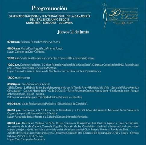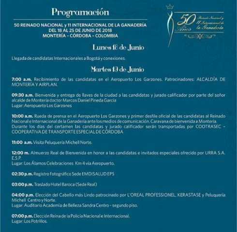 La programación del Reinado Nacional e internacional de la Ganadería iniciará desde el día martes 19 de junio en el Aeropuerto los Garzones, donde se recibirán a las candaditas, posteriormente se dará una Rueda de Prensa y luego se realizará la Entrega de Llaves de la Ciudad como acto de apertura.