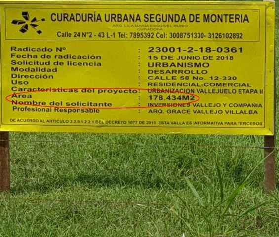 Una valla informativa de la Curaduría Urbana Segunda de Montería, instalada en un lote ubicado detrás de la Urbanización Prados de La Castellana anuncia la solicitud de licencia de urbanismo para realizar la Urbanización Vallejuelo Etapa II, en la cual habrá uso residencial y comercial.