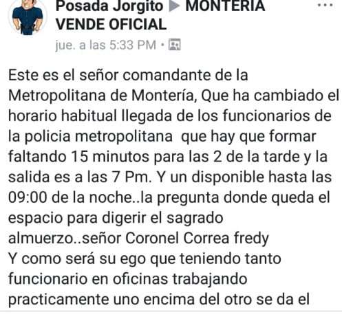 Esta queja, que ha generado polémica fue hecha a través de una cuenta falsa llamada “Posada Jorgito” en la página de Montería Vende Oficial en la red social de Facebook, donde un usuario denunció que el nuevo comandante, “ha cambiado el horario habitual de llegada de los funcionarios de la Policía Metropolitana, hay que formar faltando quince minutos para las dos de la tarde y la salida es la 7:00 PM y un disponible hasta las nueve de la noche”