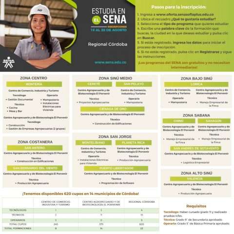 Para el caso del departamento cordobés hay disponibles 620 cupos de los cuales 375 son para el Centro Agropecuario y de Biotecnología El Porvenir y 245 para el Centro de Comercio, Industria y Turismo.