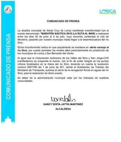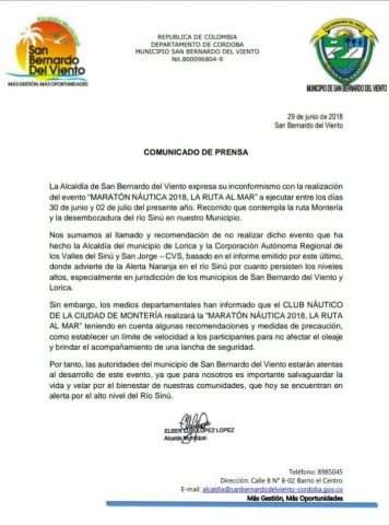 Por su parte las alcaldías de Lorica y San Bernardo a través de un comunicado de prensa indicaron que se acatan la suspención de la maratón que iba a ser desarrollada desde este sábado 30 de junio hasta el próximo lunes 2 de julio, «con el fin de evitar riesgos en los puntos críticos focalizados en la ribiera del Sinú, teniendo en cuenta la resolución número 0001798 del 1 de junio del 2018, donde el Subdirector de Tránsito del ministerio de Transporte, autoriza el cierre fluvial de las aguas del río Sinú para la realización de dicho evento», agregando además que es deber de las administraciones velar por la seguridad de sus comunidades.