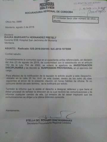 Cabe resaltar que en primera instancia la Procuraduría suspendió a la gerente del hospital por presuntamente modificar la planta de personal de la ESE en plena ley de garantías.