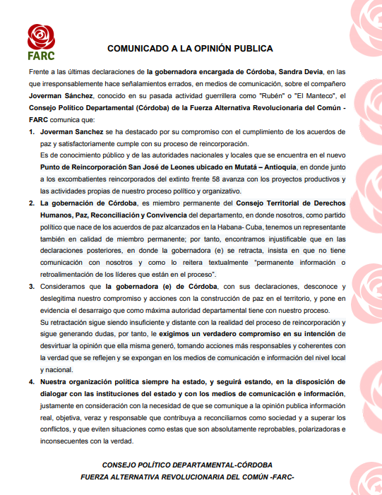 Sin embargo, el partido político Fuerza Alternativa Revolucionaria del Común (FARC), informó que encuentran injustificable que la gobernadora (e) se retracte de sus declaraciones e insista que no tiene comunicación con ellos cuando la Administración Departamental es miembro permanente del Consejo Territorial de Derechos Humanos, Paz, Reconciliación y Convivencia.