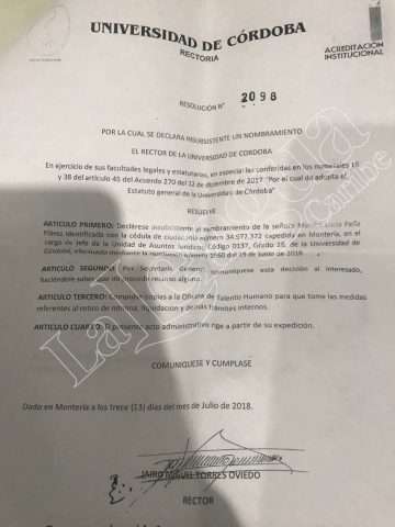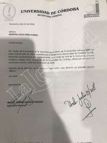 Tras la decisión del rector Emiro Madera,  quien la declaró insubsistente en el cargo  que desempeñaba como Jefe de la Unidad de Asuntos Jurídicos, código 0137, grado 18 de la universidad de Córdoba, la funcionaria inició un proceso jurídico para restablecer sus derechos, al considerar que  la declaratoria de insubsistencia fue injusta.