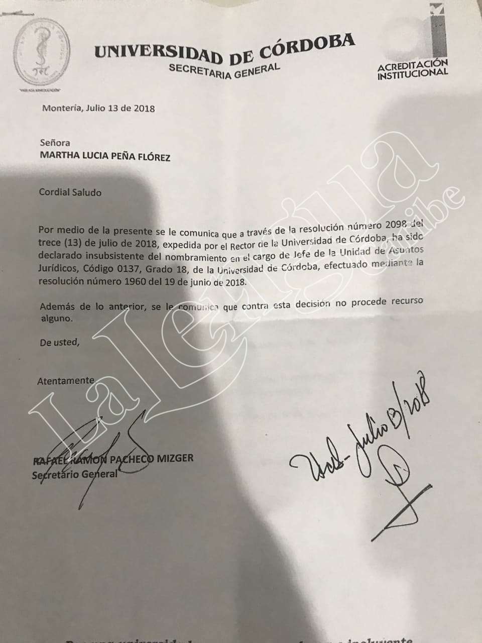 Marta Peña, una funcionaria de la universidad de Córdoba quien durante el periodo del rector  Emiro  Madera  (2010- 2012 ) fue declarada insubsistente  volvió a vivir los embates del poder y de la injusticia politica y administrativa del sector público, al ser nuevamente separada de su cargo al que volvió por medio de una orden judicial.