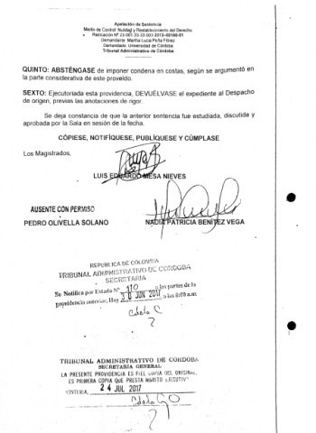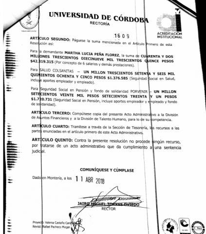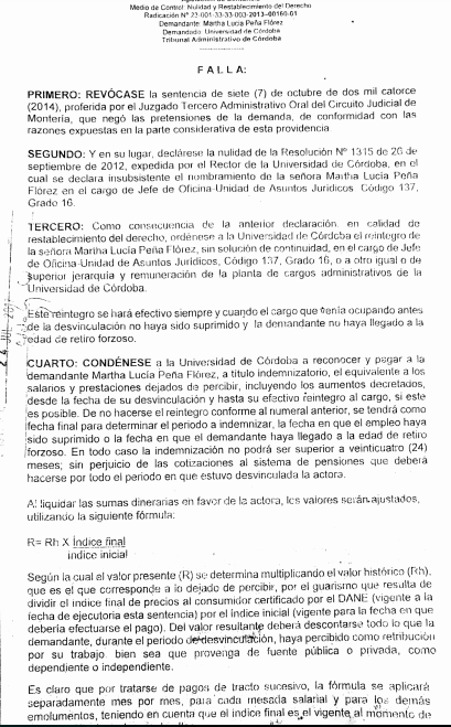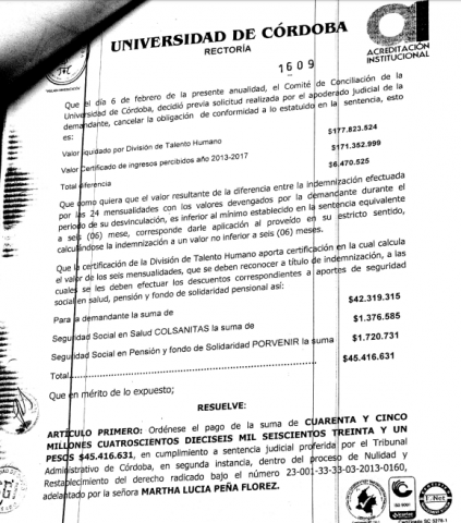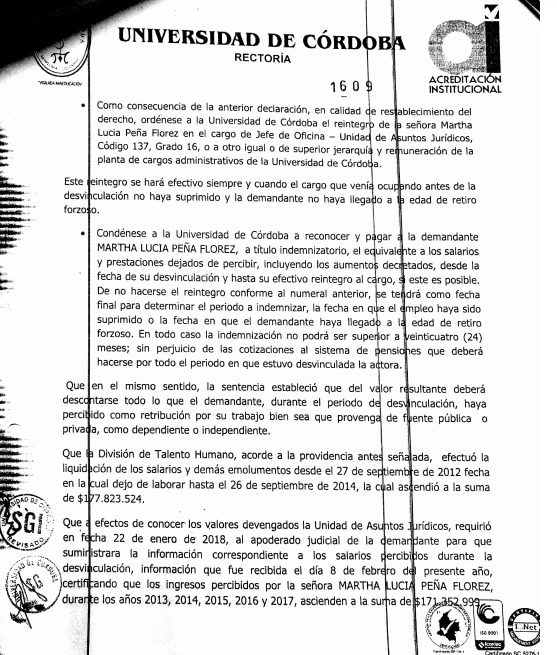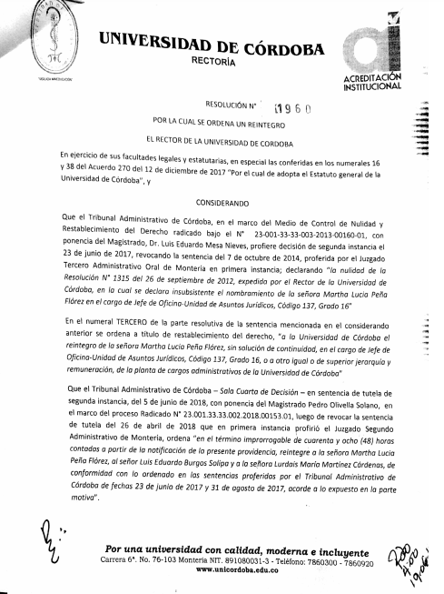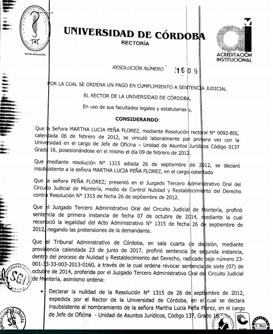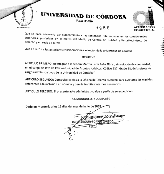 Como se recordará Marta Peña durante el periodo del rector Emiro Madera (2010- 2012 ) fue declarada insubsistente, mediante resolución número 1315 del 26 de septiembre del 2012. Pero se ordenó su reintegro a través de una sentencia de segunda instancia proferida por el tribunal Administrativo de Córdoba el 23 de junio del año pasado 2017. En tal sentido un año después se produjo el reintegro de la funcionaria mediante la resolución número 1960 del 19 de junio de este año 2018, bajo la firma del rector Jairo Torres Oviedo. Faltando tres días para que se cumpliera un mes de su reintegro el rector Jairo Torres Oviedo nuevamente la declaró insubsistente.