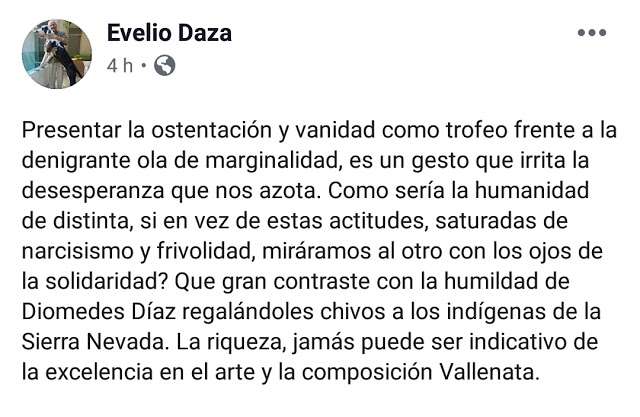 Agregó, «Que gran contraste con la humildad de Diomedes Díaz regalándoles chivos a los indígenas de la Sierra Nevada. La riqueza, jamás puede ser indicativo de la excelencia en el arte y la composición Vallenata».
