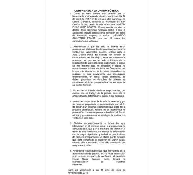 “No es cierto que entre la fiscalía, la defensa y yo, se hubiese propiciado un acercamiento con el fin de llegar a un acuerdo económico, que diera fin al proceso, reitero, no es económica mi petición, como siempre se lo he dicho al fiscal, mi hija y yo esperamos se privilegie la justicia y la verdad en este caso”, dice la mujer.