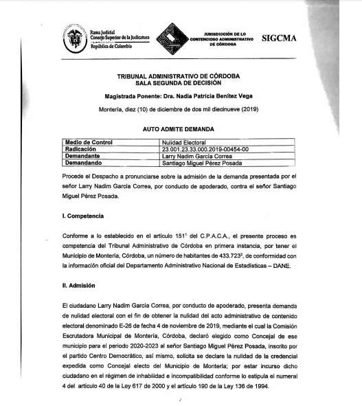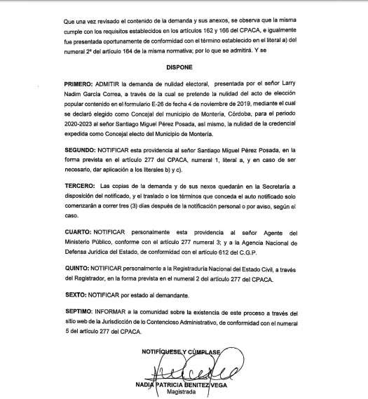 El documento emitido por el Tribunal Administrativo dispone inicialmente, “admitir la demanda de nulidad electoral, presentada por el señor Larry Nadim García Correa, a través de la cual se pretende la nulidad del acto de elección popular contenido en el formulario E-26 de fecha 4 de noviembre de 2019, mediante el cual se declaró como concejal del municipio de Montería, Córdoba, para el periodo 2020-2023 al señor Santiago Miguel Pérez Posada”.