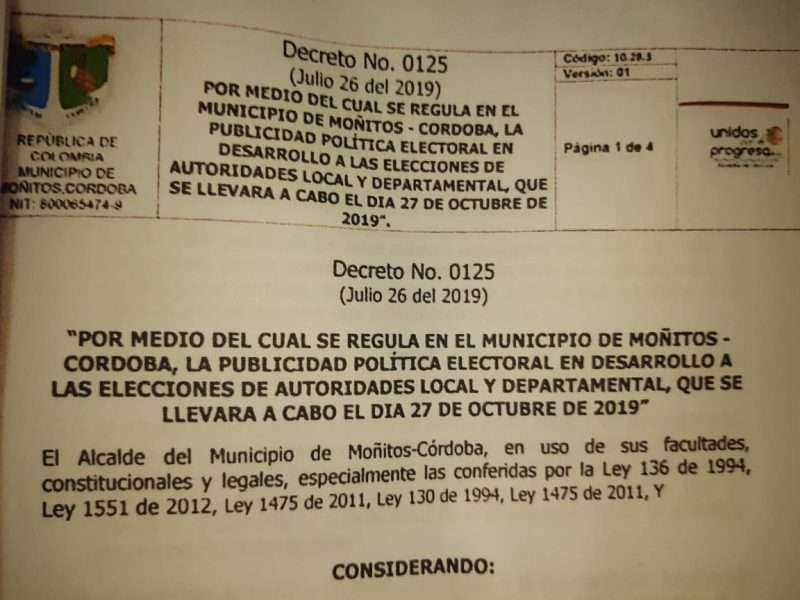 El pasado 2 de septiembre, se llevó a cabo en el municipio de Moñitos el comité de seguimiento electoral que fue presidido por el secretario de Gobierno, Héctor Mario Zúñiga. En la reunión los ánimos se caldearon pues el decreto que regula la publicidad política en el municipio estaría engavetado.