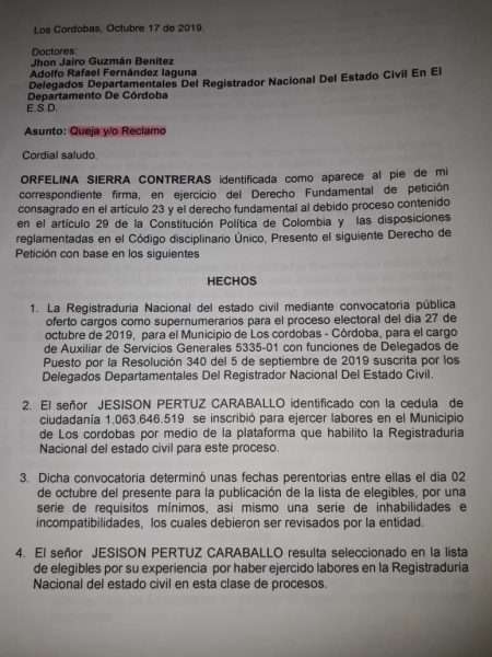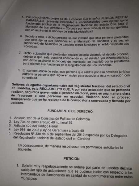 En el derecho de petición, Contreras explica que la Registraduría Nacional ofertó cargos como supernumerarios para el proceso electoral que se llevará a cabo el próximo domingo 27 de octubre, en dicha convocatoria se inscribió Jesison Pertuz para ejercer labores de auxiliar de servicios generales en el municipio de Los Córdobas, sin embargo, este no estaría habilitado para ese ejercicio ya que posee un vínculo de consanguinidad con un aspirante al Concejo de esa municipalidad.