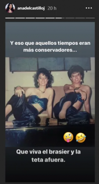 Ajunto a la imagen, Ana escribió un mensaje en el que señaló «Y eso que aquellos tiempos eran más conservadores… Qué viva el brasier y la teta afuera».
