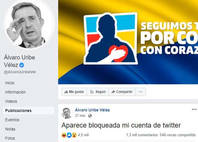 A través de su cuenta de Facebook, el expresidente de Colombia, y ahora senador de la República, Álvaro Uribe Vélez denunció que su cuenta de twitter ha sido bloqueada.