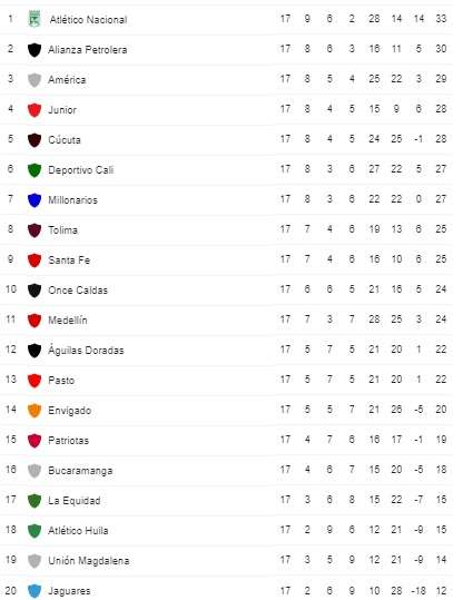Además, en la tabla del descenso hay suspenso ya que son cinco equipos los que están en peligro y que están apretando en este cierre del torneo para mantener la categoría: Rionegro (134), Envigado (134), Jaguares (133), U. Magdalena (132) y Atlético Huila (130), se encuentran de la casilla 16 a la 20 en la reclasificación, respectivamente.