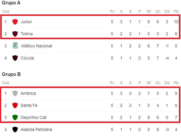 Por el Grupo A: Junior se impuso 1-0 ante Cúcuta y ratificó su liderato al llegar a 10 unidades, mientras que Tolima igualó 1-1 en su visita a Atlético Nacional y se quedó con la segunda casilla al alcanzar las ocho unidades.