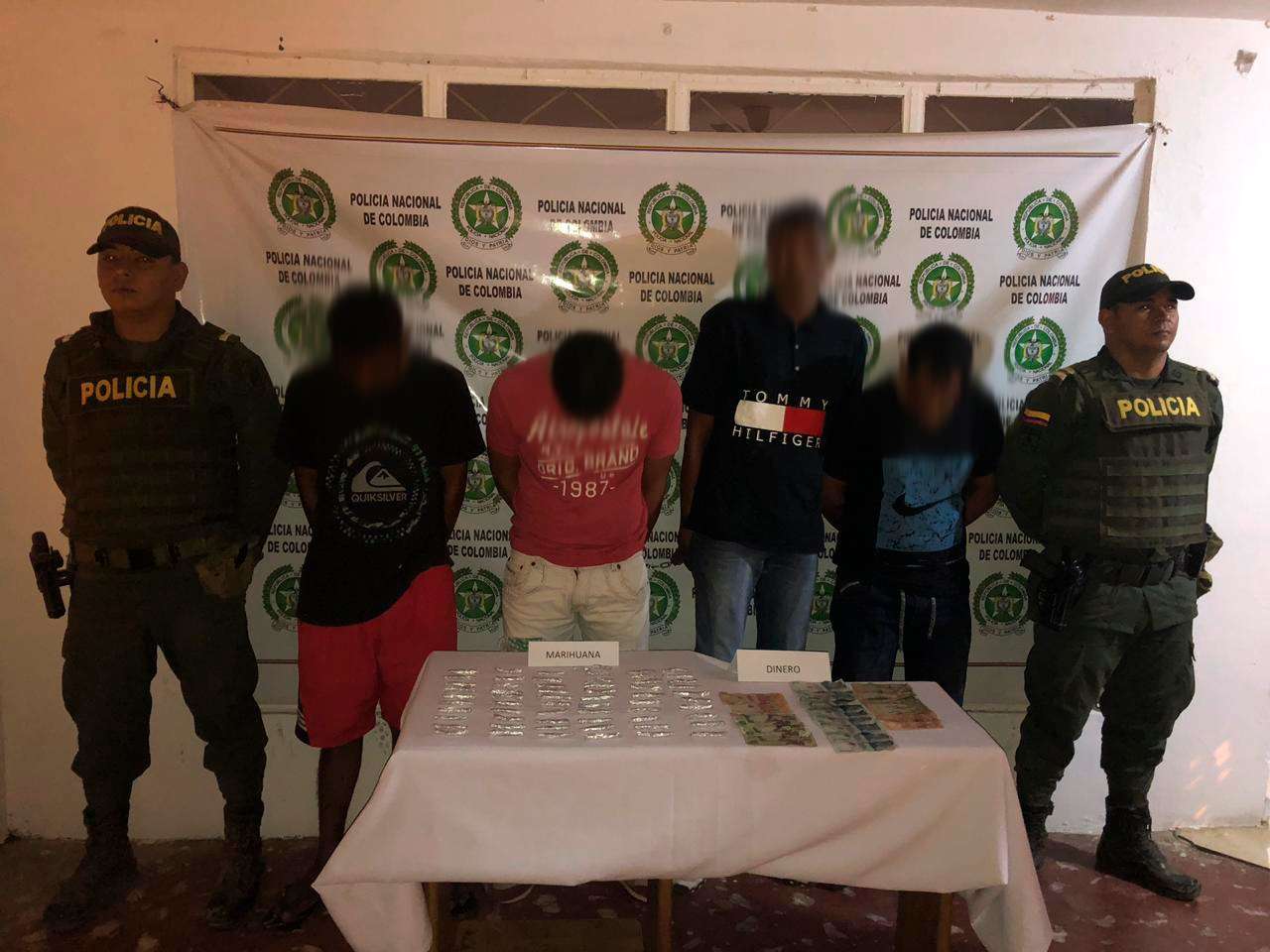 Los hechos sucedieron en el barrio Corina Uribe donde en medio de un operativo de registro y control, los uniformados sorprendieron a los sujetos de 29, 19, 24 y 28 años, portando más de 80 dosis de marihuana y dinero en efectivo, al parecer, producto de su comercialización.