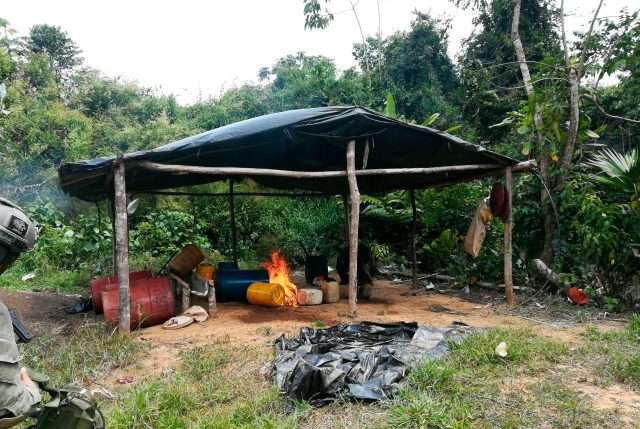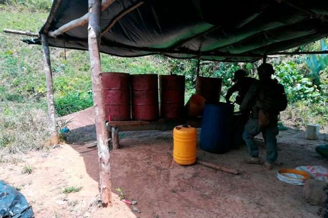 De acuerdo al reporte judicial, los laboratorios estaban compuestos por construcciones rusticas, exteriores en plástico, color negro y pisos en madera, camuflados con la espesa vegetación propia de la zona, ubicando un total de 661 galones de insumos líquidos, 43.80 kilogramos de base de cocaína y elementos y equipos para el procesamiento de estupefacientes.
