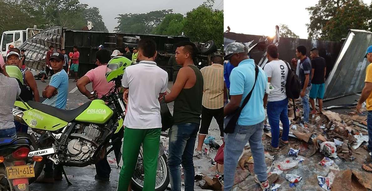 En horas de la madrugada de este viernes 8 de noviembre un camión que transportaba víveres se volcó en la vía que de Cereté conduce a Ciénaga de Oro, Córdoba.
