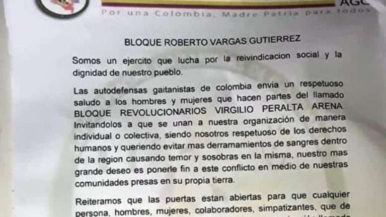 En dicho panfleto las Autodefensas Gaitanistas de Colombia, comúnmente conocidas como ‘Clan del Golfo’, le ofrecen a ‘Los Caparrapos’ unirse a sus filas para evitar “derramamiento de sangre en la región y consolidar un objetivo político”.