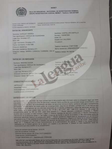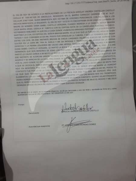 Ante esta situación, Castellar Castilla fue a realizar la respectiva denuncia en la Fiscalía donde casualmente con el mayor de los descaros se encontró a este sujeto, que llegó hasta el lugar con un cinismo a poner una querella contra las dos mujeres por agresión física.