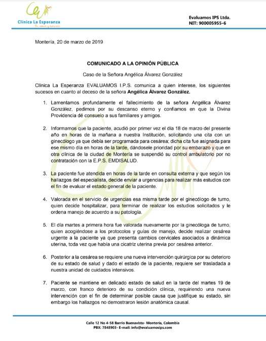 Así lo denunciaron los familiares de la víctima, quienes aseguraron que la mujer llegó el lunes 18 de marzo a una cita médica en la Clínica La Esperanza Evaluamos donde los médicos de turno decidieron hospitalizarla y programarle la cesárea tras detectarle preeclampsia.