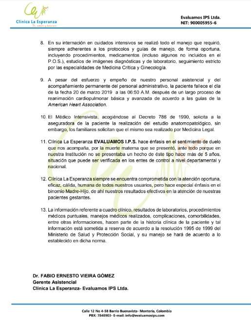 Por su parte, la Clínica Evaluamos informó a través de un comunicado que lamentaba el fallecimiento y que un caso similar no se presentaba hacía cinco años.