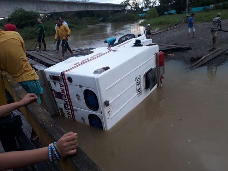 Este viernes 31 de mayo una ambulancia que cruzaba el río Sinú en un planchón para llegar al municipio de Valencia, Córdoba, se salió de la plataforma y se volcó en el afluente.