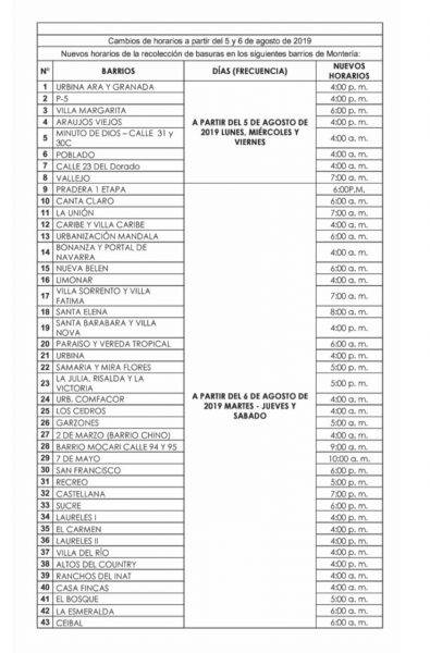 La empresa de aseo Servigenerales anunció que habrá cambios en los horarios de recolección de los residuos sólidos a partir del lunes 5 de agosto y martes 6 de agosto de 2019.