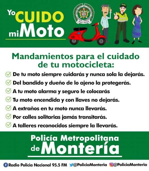 Con el fin de evitar el hurto a motocicletas, la Policía Metropolitana de Montería lanzó la campaña “Yo cuido mi moto”, basada en la difusión de recomendaciones para prevenir el robo de los vehículos en el área urbana y rural de la capital cordobesa, los cuales en su mayoría son facilitados por el descuido de los propietarios.