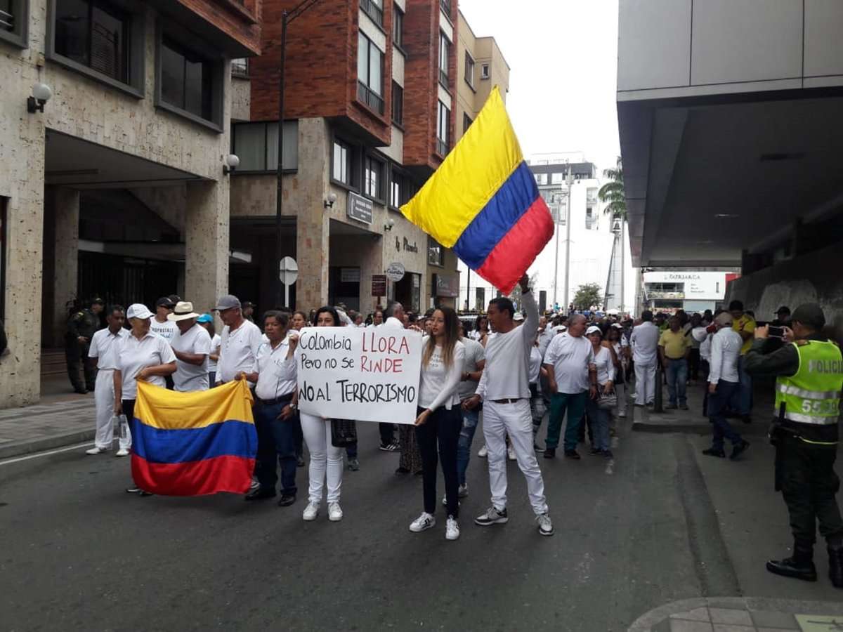 Con las consignas, ‘No más terrorismo’, ‘Colombia unida, jamás será vencida’, ‘Colombia le dice sí a la vida y a la paz’, marcharon en ciudades como Bogotá, Cali, Armenia, Cúcuta, Bucaramanga, Medellín, Santa Marta, Montería, entre otras.